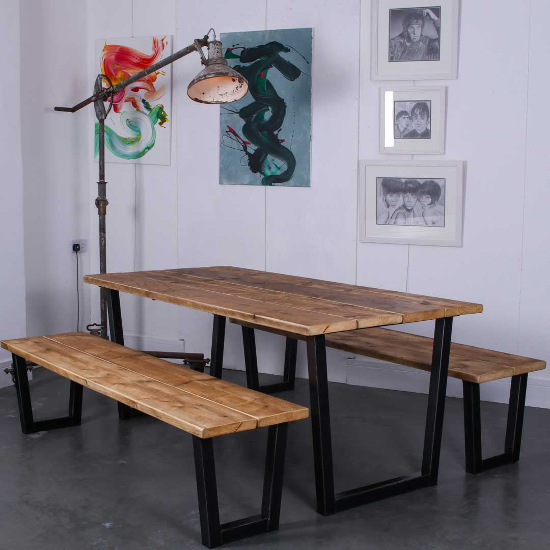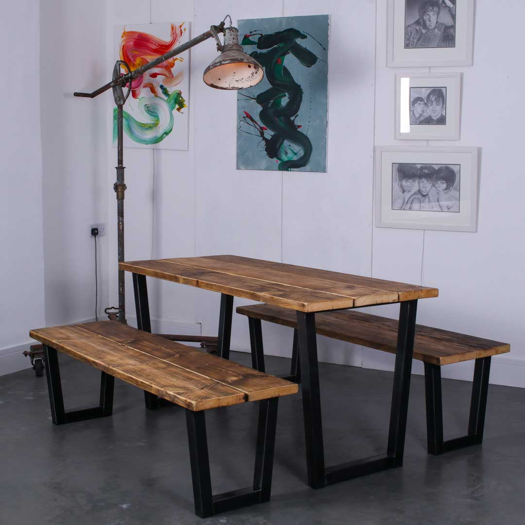 We love to use reclaimed wood, giving it a new lease of life. Once sanded and oiled the true beauty and character of the wood shines through. The metal bench bases are welded and fabricated in our Swansea workshop. We only use quality steel, much thicker than foreign imports. The steel is wire brushed and then coated with a durable clear lacquer to prevent rusting. Plastic bungs are used to plug the legs of the benches. Felt pads can also be stuck to these protect floors further and level uneven surfaces.